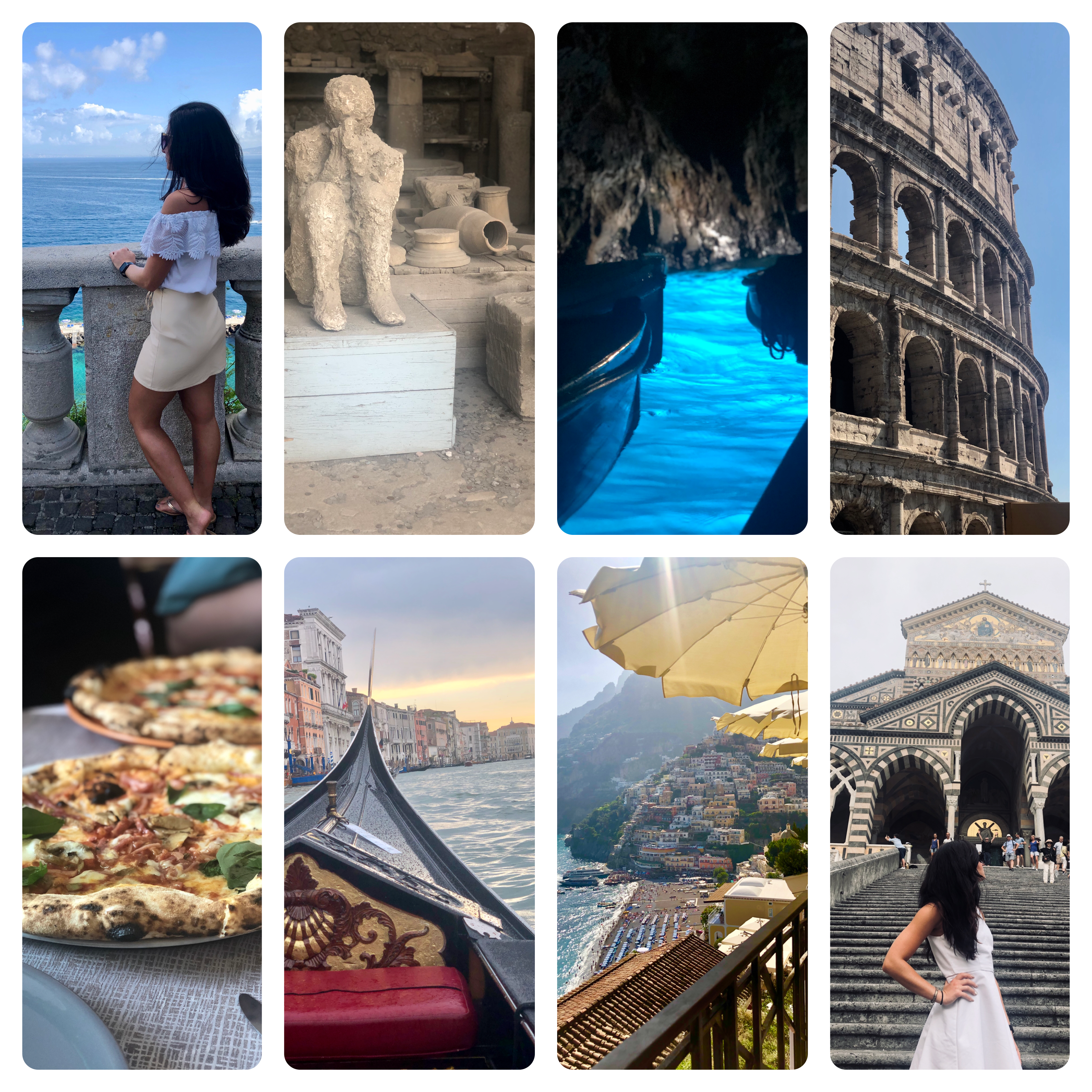 Experiences. While in Italy, I had the opportunity to visit a total of 8 different places: Sorrento, Rome, Venice, Positano, Capri, Amalfi, Naples, and Pompeii. Each journey offered me so many different perspectives and memories. While in Sorrento, I fell in love with the small town charm and homey feel. While in Rome, I loved seeing some of the world’s most amazing structures all in one day (Colosseum, Vatican City, Trevi Fountain, Spanish Steps, & Pantheon). While in Venice, I gawked over the famous canals and gondola ride. While in Positano, I couldn’t take my eyes of the pyramid-shaped layout of the buildings on the side of the mountain. That world-renowned view had served as my phone background for months before arriving to Italy; seeing it in person was a dream. While in Capri, I felt as if I were on cloud nine as I entered The Blue Grotto, a natural sea cave sparkling with bright azure-colored water. While in Amalfi, I explored the historical streets and gazed up at the breathtaking cathedral. While in Naples, I had a very happy stomach as I ate some of the best pizza ever in the city it was invented. While in Pompeii, I felt like I had stepped into a time machine as I walked through perfectly preserved streets and seeing items from 79 AD. Exploring the beautiful country of Italy was such an amazing experience, and I’m happy to know there’s more as I will return some day.