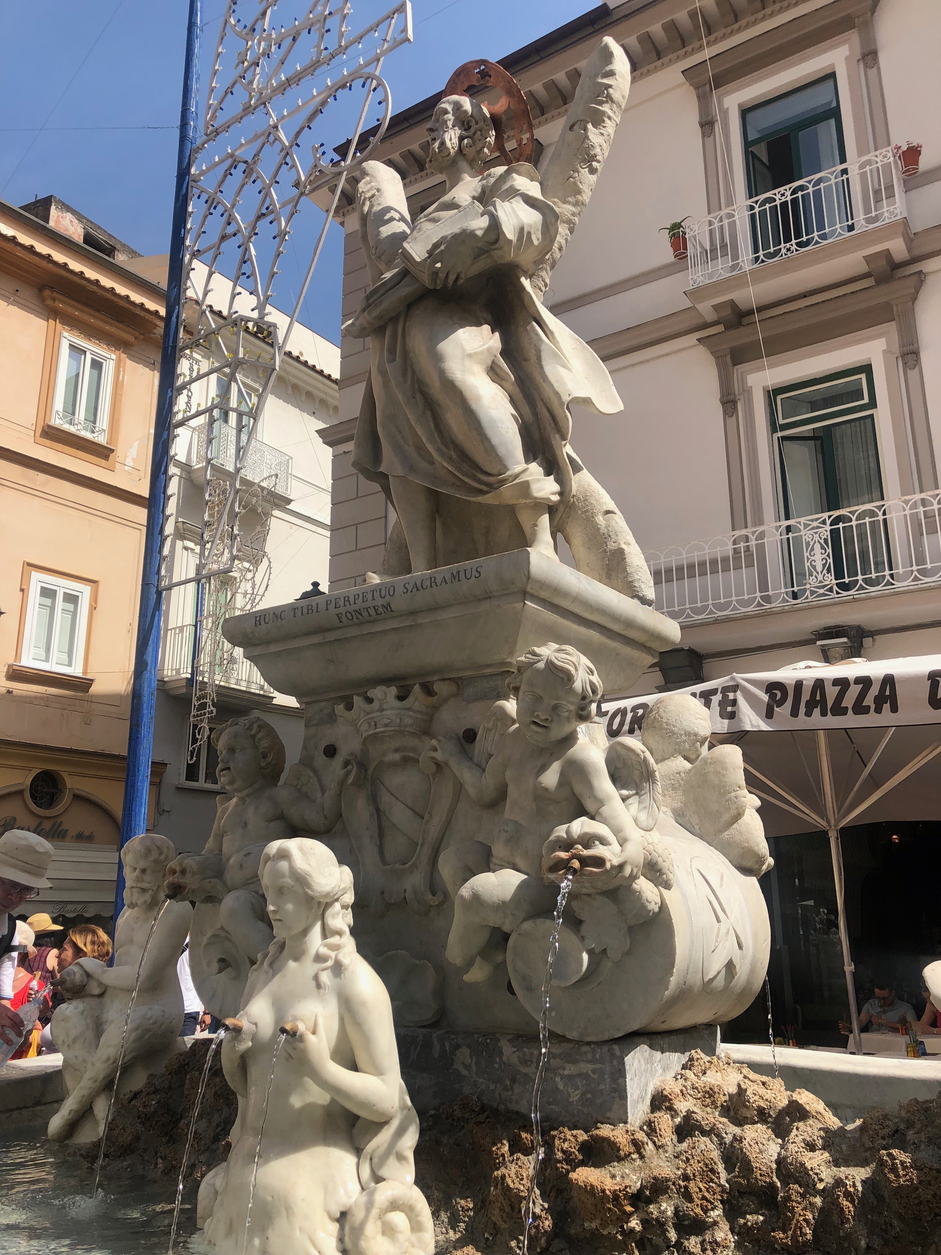 Fountains of Fresh Water. Throughout all of Amalfi, there are fresh-water fountains for all to use. Some of them depict ancient works of art, such as the fountain outside of the cathedral. Also, Nativity Scenes have long been a tradition in and around Amalfi. A few of them are even in fountains, serving as both a refreshing purpose and view.